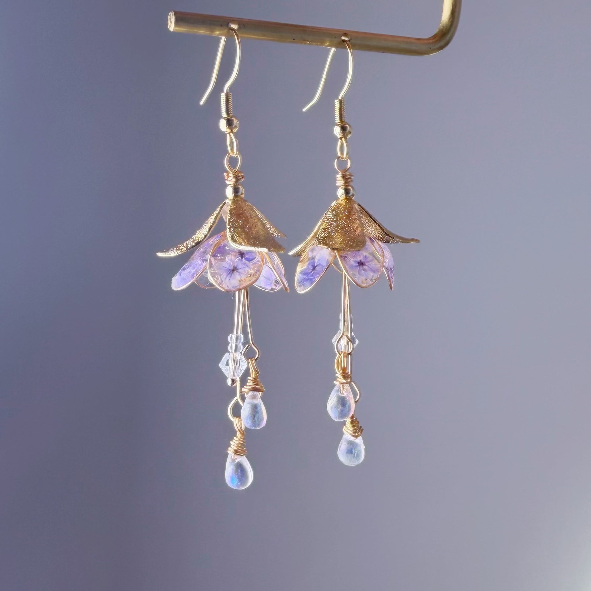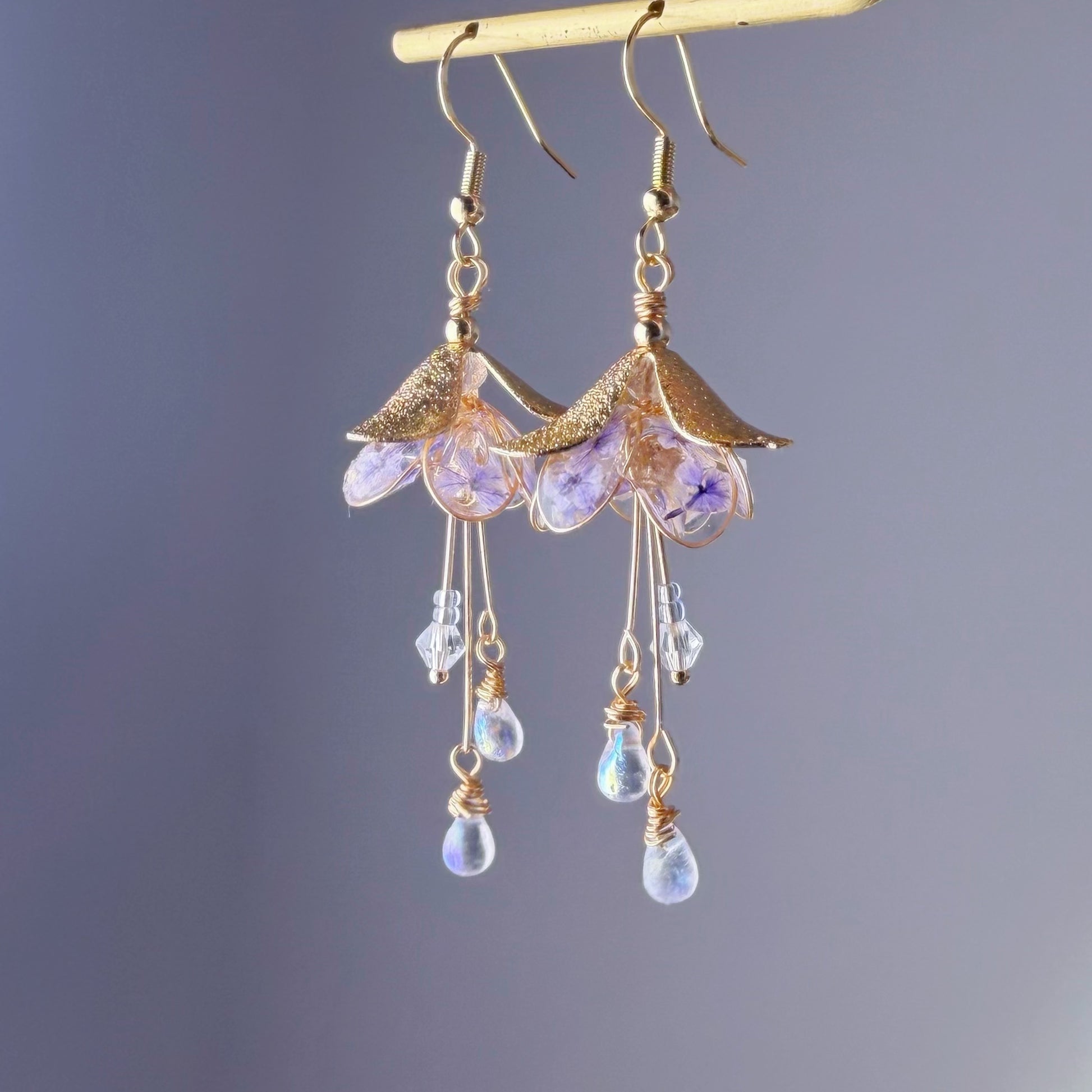 Inspired by the beloved fuchsia that graces British gardens, these striking earrings capture nature's elegance in resin. Each pair features genuine blue-purple pressed flowers suspended in crystal-clear resin, creating a one-of-a-kind wearable art piece. Perfect for flower enthusiasts and nature lovers, these handmade earrings make a thoughtful, distinctive gift that celebrates botanical beauty. Lightweight and comfortable for everyday wear, they're a conversation starter that brings a touch of garden magic to any outfit.
