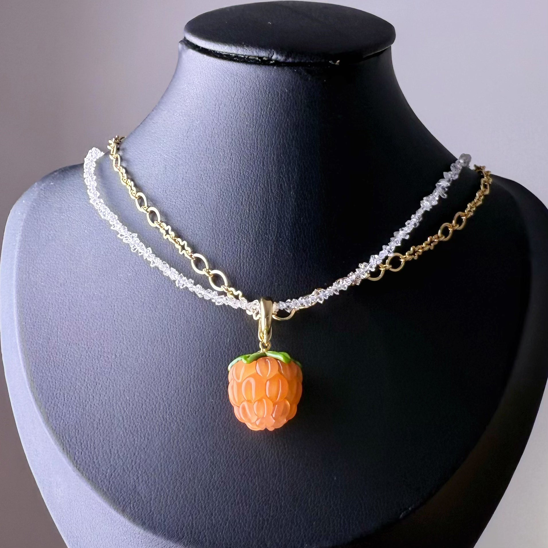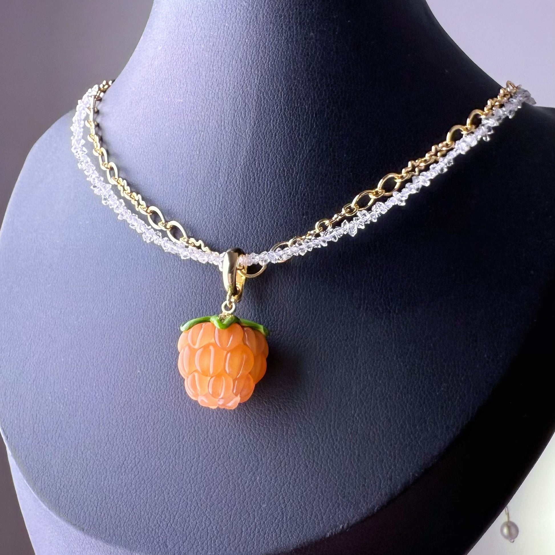 Size of Herkimer Diamond crystal: around 3mm, Size of glass raspberry: around 10mmx12mm; Length of necklace: adjustable from 30cm to 35cm (contact for custom length)