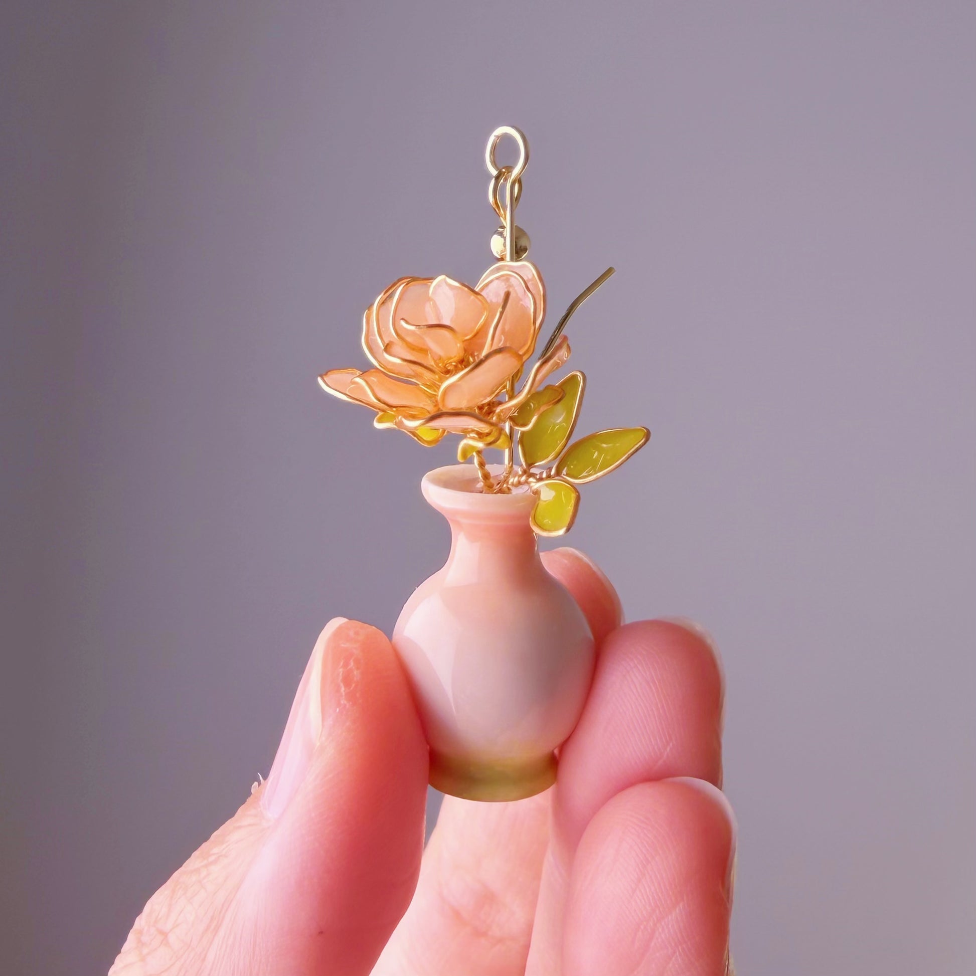 Delicate handmade rose earrings capture the charm of fresh peach-toned blooms nestled in a miniature vase. Each pair showcases intricate floral craftsmanship with warm, romantic hues that complement any complexion. Perfect as a thoughtful gift for flower lovers, these wearable art pieces bring botanical beauty to everyday style.