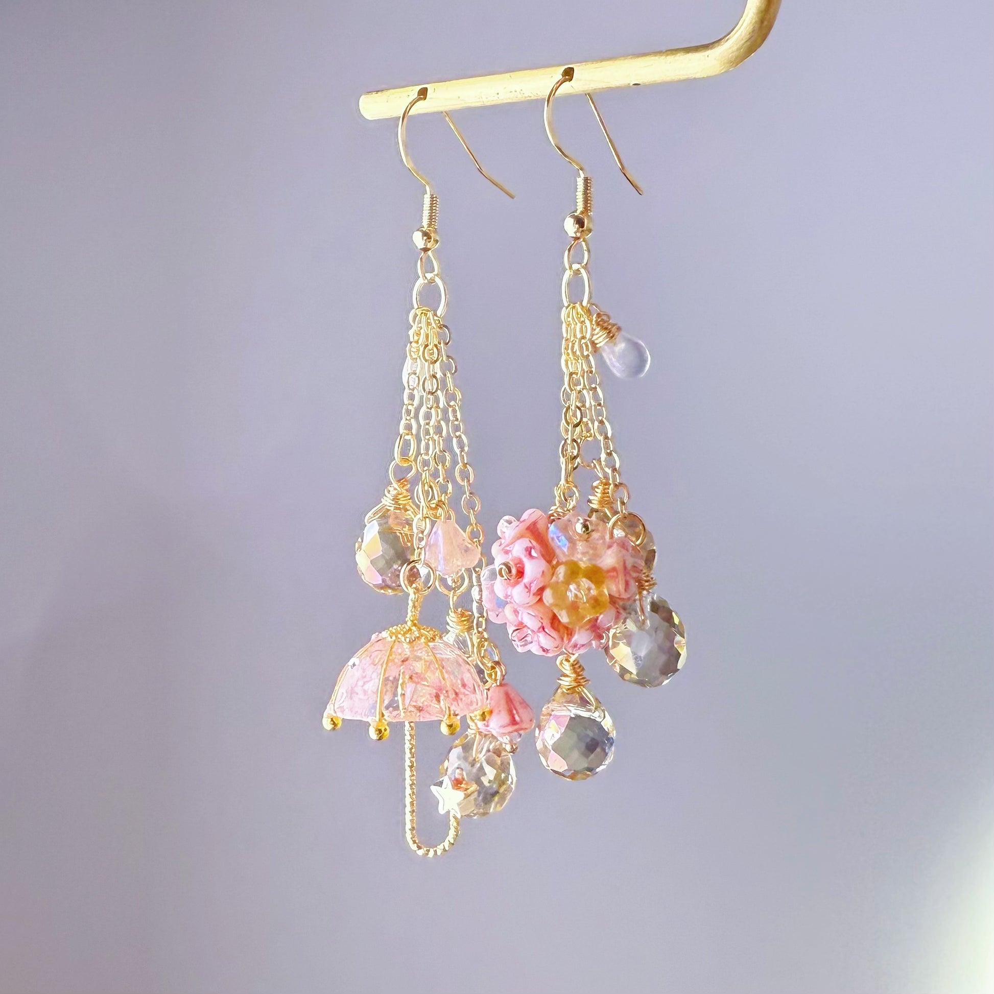 The raindrops and flowers: Czech glass beads; The umbrella: pressed flowers and resin;
