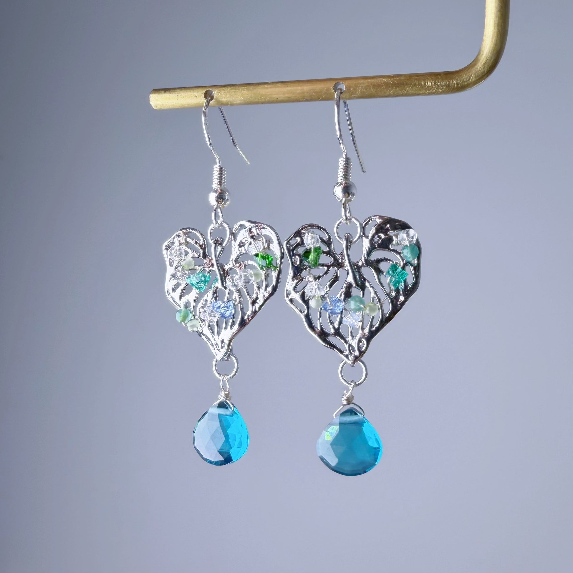 These exquisite handmade earrings draw inspiration from the iconic silhouette of Monstera leaves, reimagined in gleaming silver. Tiny crystals are artfully positioned across each leaf like morning dew, creating an enchanting interplay of light and shadow. A luminous blue teardrop quartz crystal completes the design, swaying gently with every movement. Ideal as a gift for someone who treasures botanical beauty and natural gemstones.