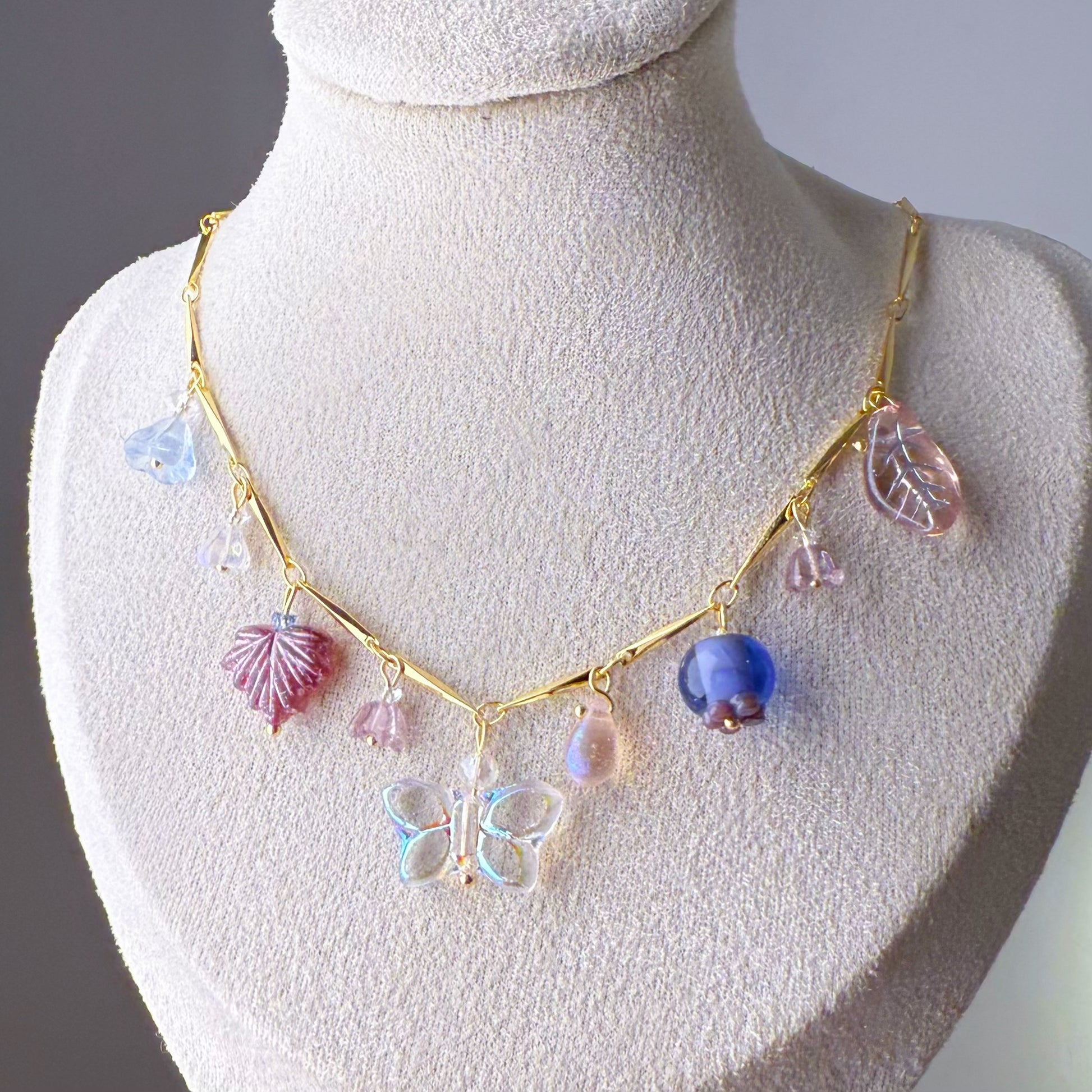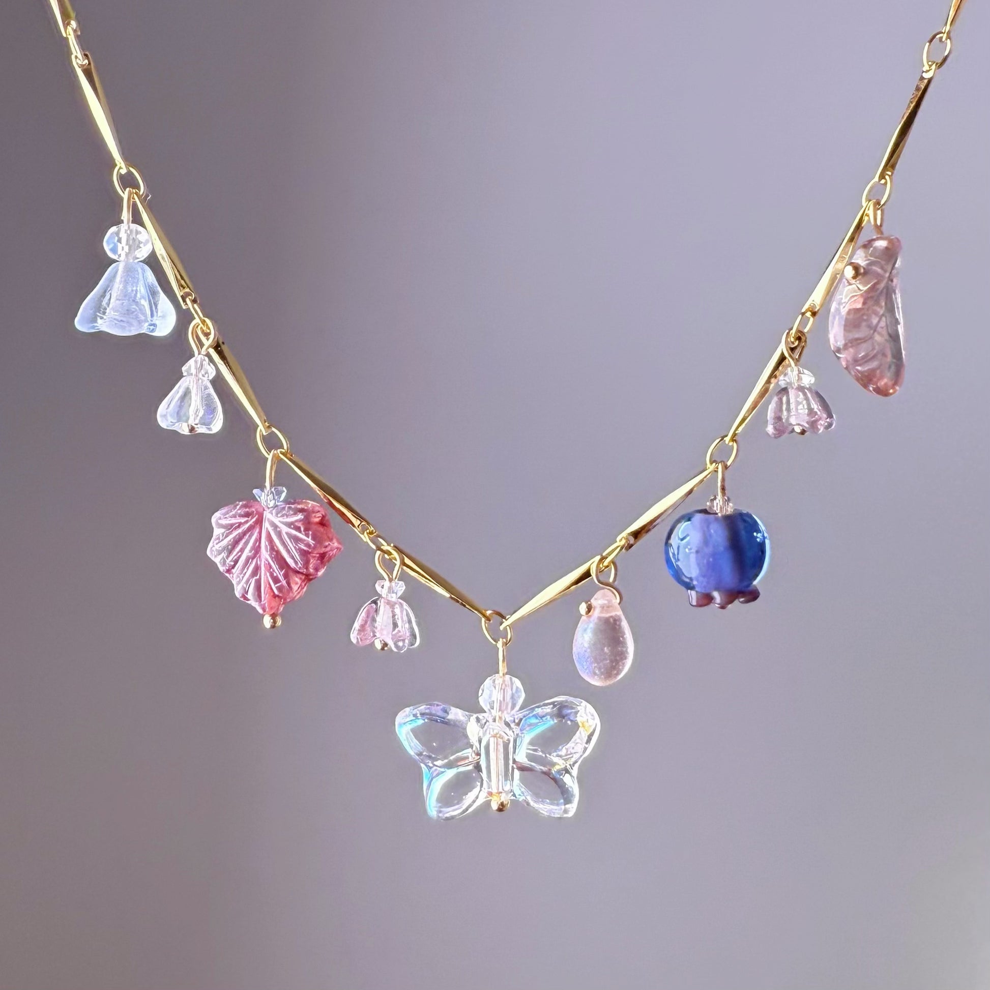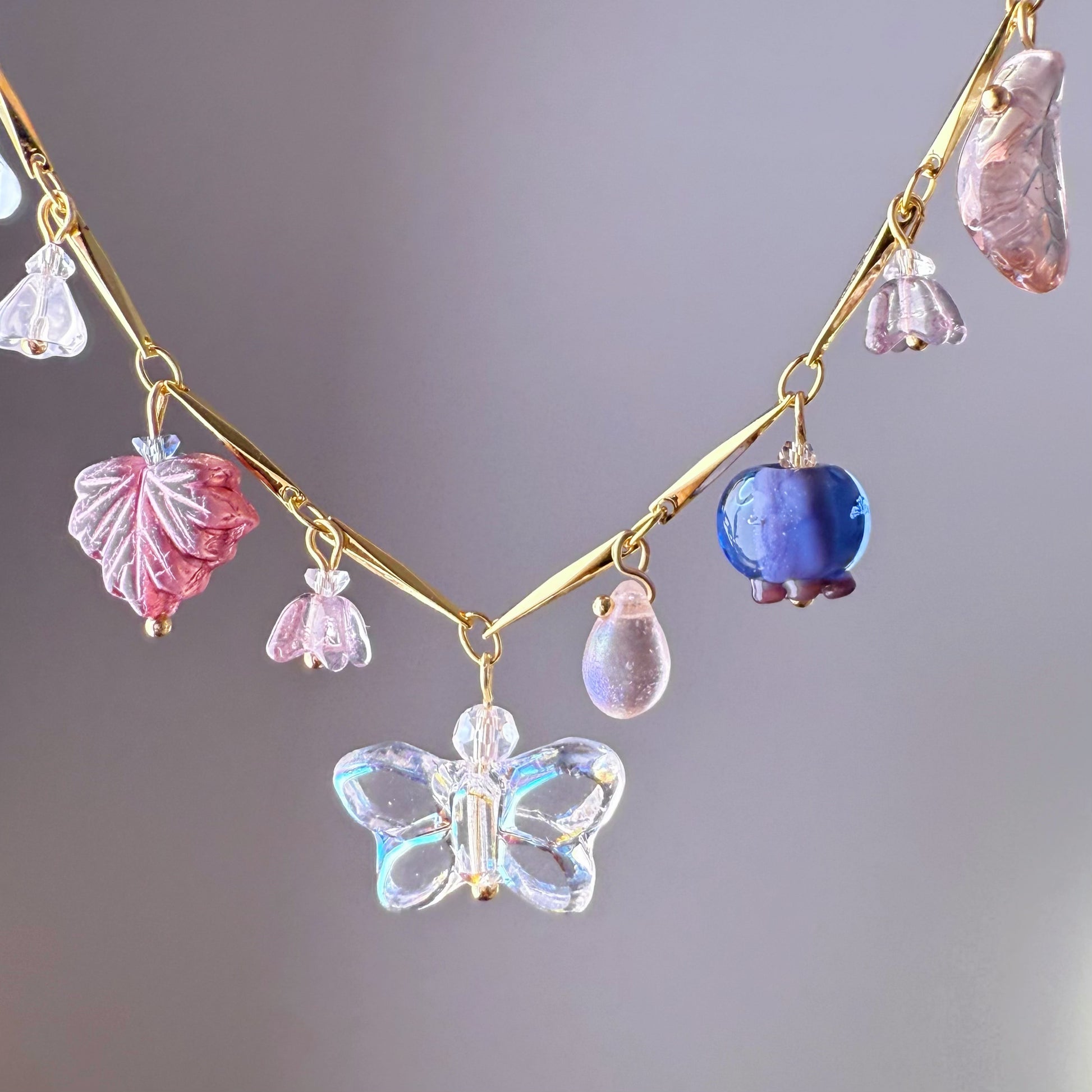 Embrace the enchanting hues of a summer garden with this handmade necklace featuring flowers and berries in a captivating purple theme. Crafted from high-quality Czech glass beads, it offers vibrant color and delicate detail to elevate any look. Perfect as a gift, this necklace captures the beauty and elegance of nature in a wearable work of art.