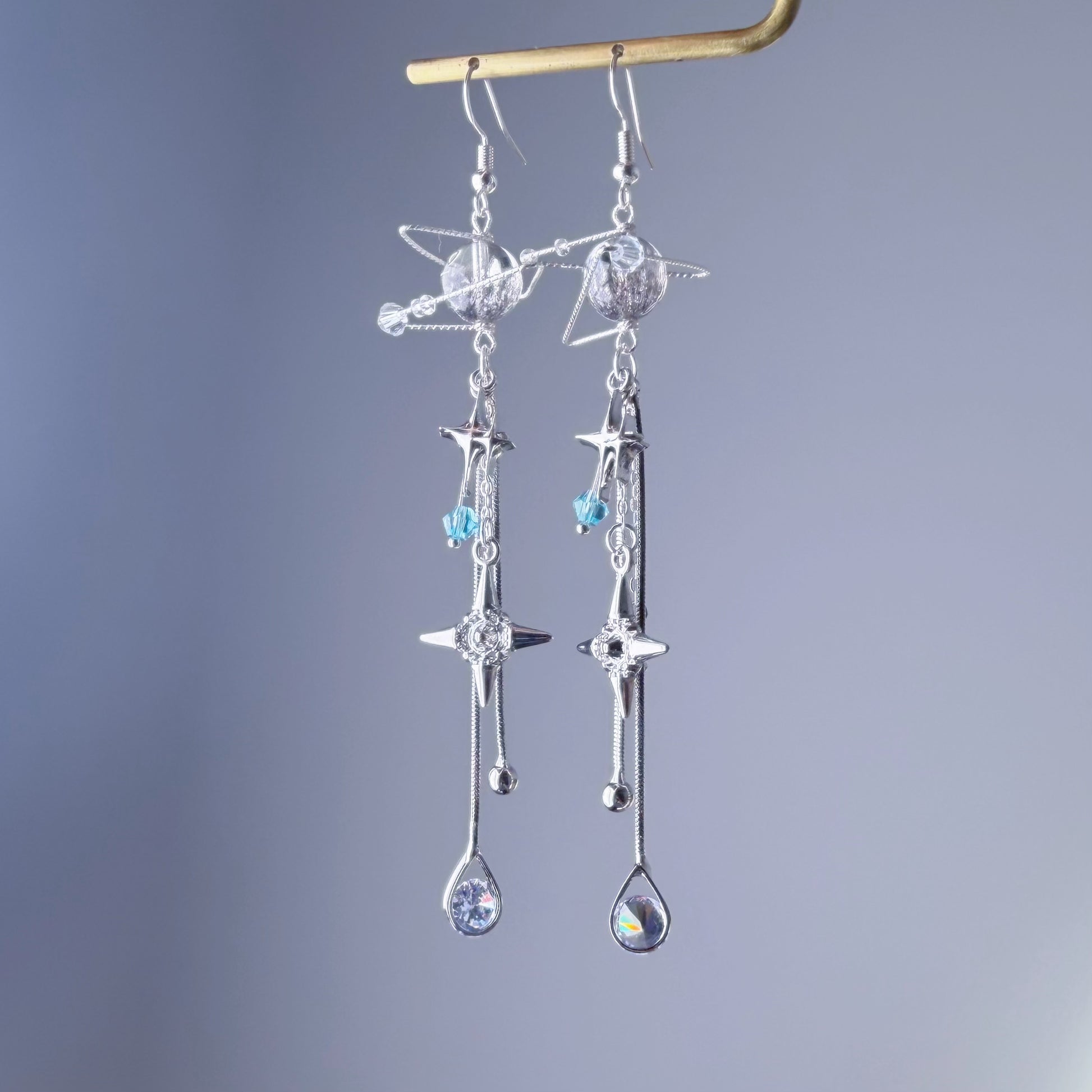 Quartz Crystal Planet with Falling Stars Silver Drop Earrings