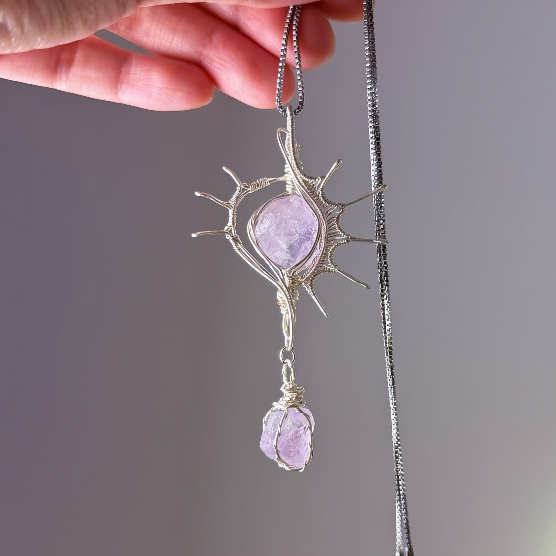 Crystal - natural amethyst; wire - silver-plated bronze; chain - stainless steel (contact for custom chain);